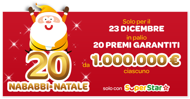 “20 Nababbi a Natale” è, infatti, il nome dell’iniziativa speciale di SuperEnalotto SuperStar che nel concorso n. 154 di sabato 23 dicembre 2017 assegnerà ben 20 premi garantiti da 1 milione di euro ciascuno.